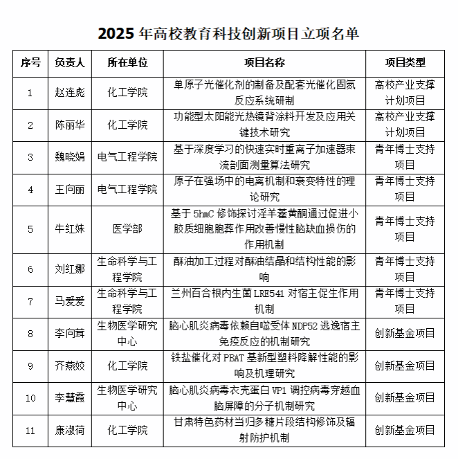 12月19日,甘肃省教育厅公布2025年高校教育科技创新项目拟立项名单,学校获批高校教育科技创新项目11项,其中高校产业支撑计划项目2项,青年博士支持项目5项,创新基金项目4项。