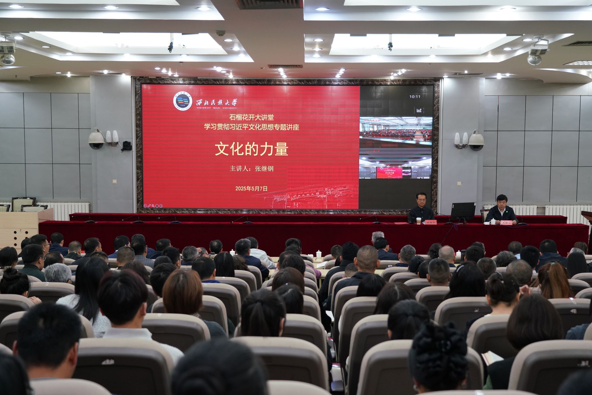 5月7日上午,著名导演、艺术家、艺术教育家、文艺理论家张继钢受邀作客学校“石榴花开大讲堂”,以《文化的力量》为题作专题讲座。学校党委书记张俊豪主持讲座,干部师生代表600余人在两校区会场聆听。